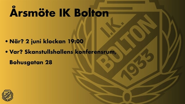Den 2 juni välkomnar vi alla medlemmar till IK Boltons årsmöte. Årsmötet kommer genomföras i konferensrummet i Skanstullshallen klockan 19:00. Vi siktar på att mötet är slut senast 20:00. Årsmöteshandlingarna kommer finnas tillgängliga på hemsidan under fliken Dokument från och med den 12 maj. Motioner skickas in senast 2 veckor innan årsmötet och skickas in till pelle.ullholm@gmail.com